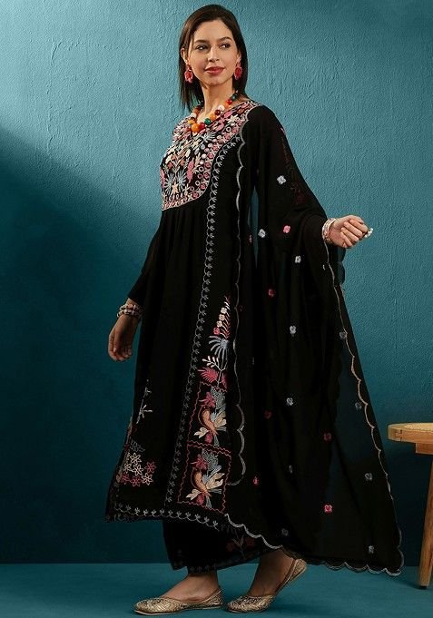 This Black Mirror Thread Embroidered Georgette Kurta Set is made from premium fabrics, ensuring comfort while keeping you stylish.