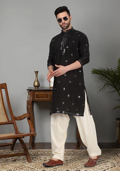 Experience timeless elegance with our Black Yoke Design Cotton Silk Kurta For Men, crafted to add a royal touch to your wardrobe.