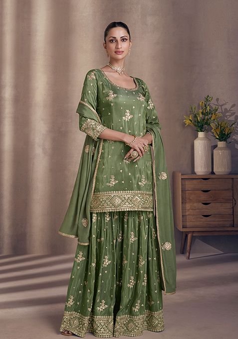This Green Sequin Embroidered Chinon Kurta Set is made from premium fabrics, ensuring comfort while keeping you stylish.