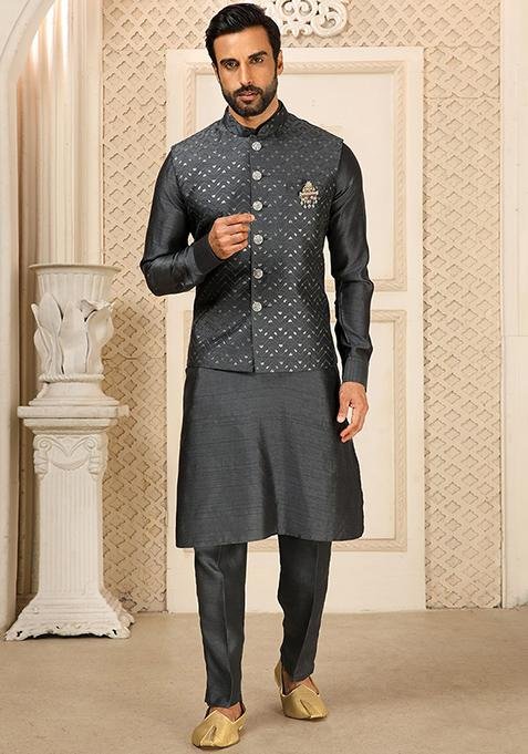This Grey Sequence Embroidered Silk Kurta Set For Men is made from premium fabrics, ensuring comfort while keeping you stylish.