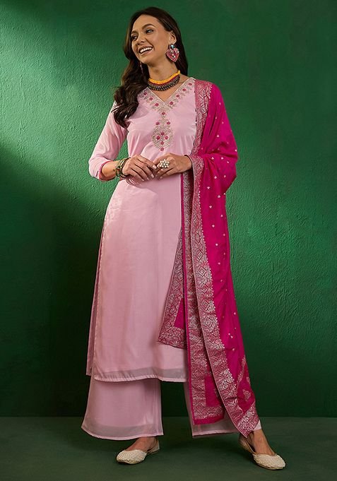 This Light Pink Zari Sequin Embroidered Chiffon Kurta Set is made from premium fabrics, ensuring comfort while keeping you stylish.