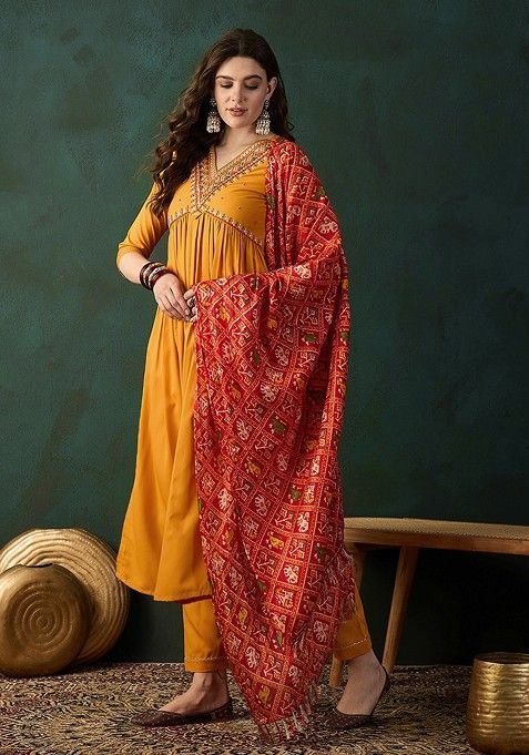 This Mustard Zari Sequin Embroidered Crepe Kurta Set is made from premium fabrics, ensuring comfort while keeping you stylish.