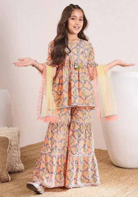 Designed to suit all body types, the Orange Printed Kurta With Sharara And Dupatta (Set of 3) blends tradition with modern aesthetics.