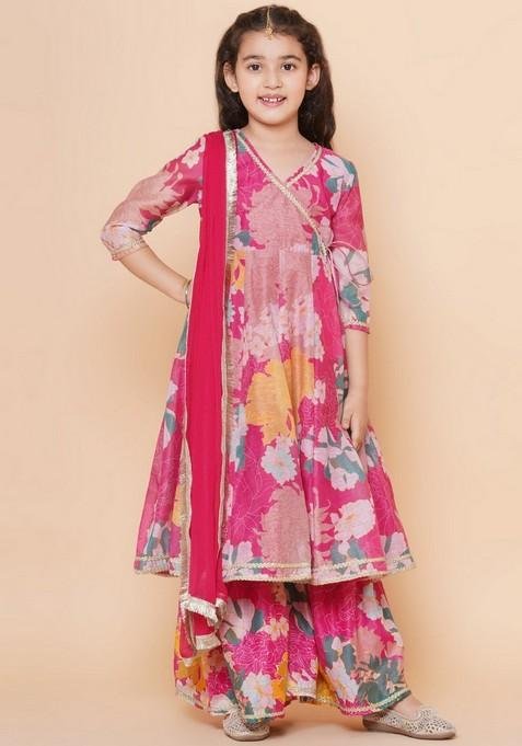 Designed to suit all body types, the Pink Floral Print Sharara With Angrakha Kurta And Dupatta (Set of 3) blends tradition with modern aesthetics.