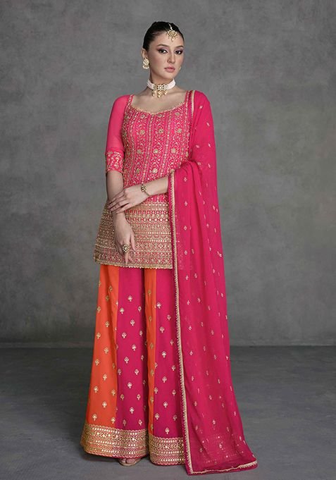 This Pink Sequin Embroidered Georgette Kurta Set is made from premium fabrics, ensuring comfort while keeping you stylish.