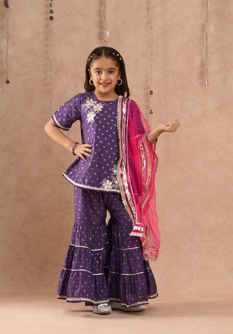 Designed to suit all body types, the Purple Foil Print Sharara With Kurta (Set of 2) blends tradition with modern aesthetics.
