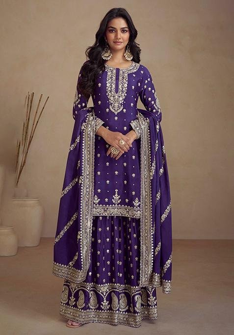 This Purple Sequin Embroidered Chinon Kurta Set is made from premium fabrics, ensuring comfort while keeping you stylish.