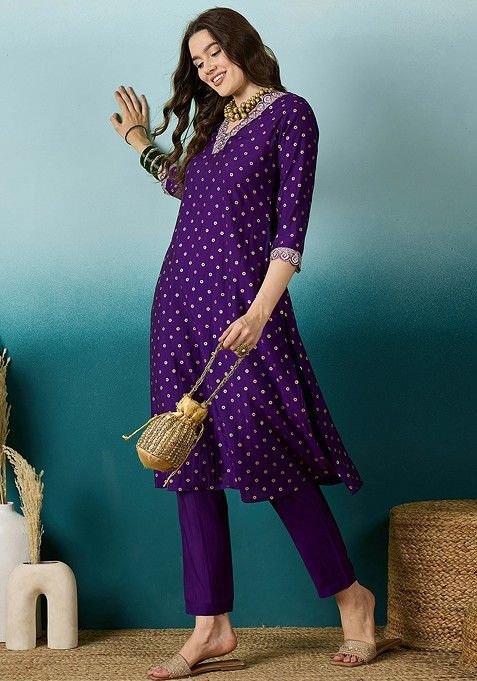 This Purple Zari Sequin Embroidered Chinon Kurta Set is made from premium fabrics, ensuring comfort while keeping you stylish.