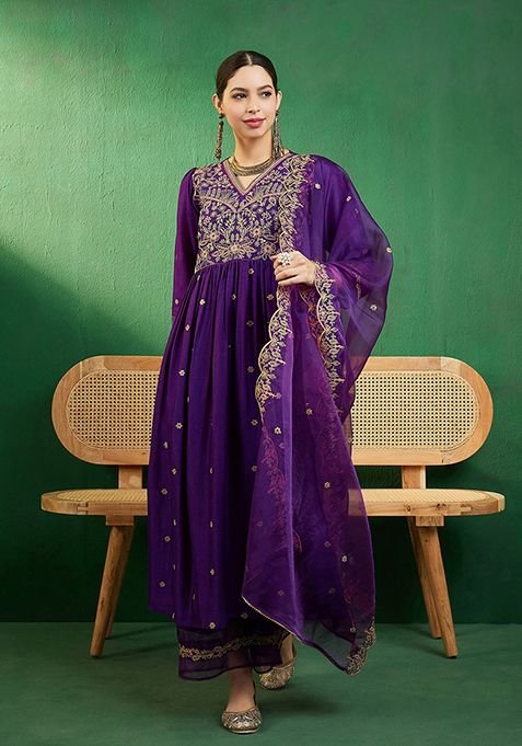 Designed to suit all body types, the Purple Zari Sequin Embroidered Vichitra Kurta Set blends tradition with modern aesthetics.