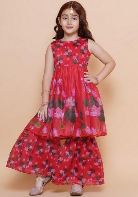 This Red Floral Print Kurta With Sharara (Set of 2) is made from premium fabrics, ensuring comfort while keeping you stylish.