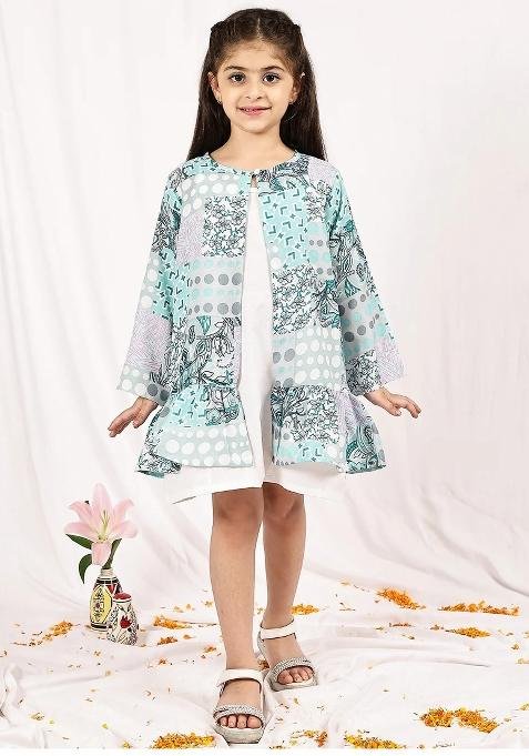 Designed to suit all body types, the Turquoise Floral Cotton Blend Dress With Shrug For Girls blends tradition with modern aesthetics.