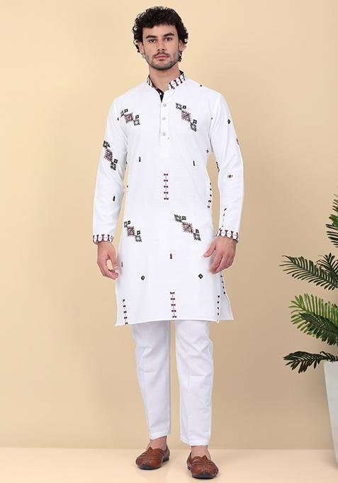 Designed to suit all body types, the White Embroidered Linen Kurta Set For Men blends tradition with modern aesthetics.