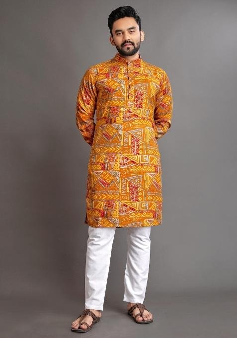 This Yellow Embroidered Cotton Kurta With Pyjama For Men is made from premium fabrics, ensuring comfort while keeping you stylish.