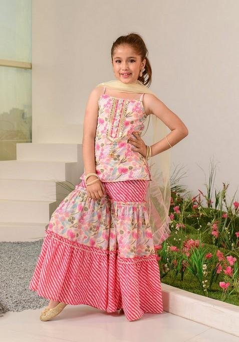 Designed to suit all body types, the Yellow Printed Kurta With Sharara And Dupatta (Set of 3) blends tradition with modern aesthetics.